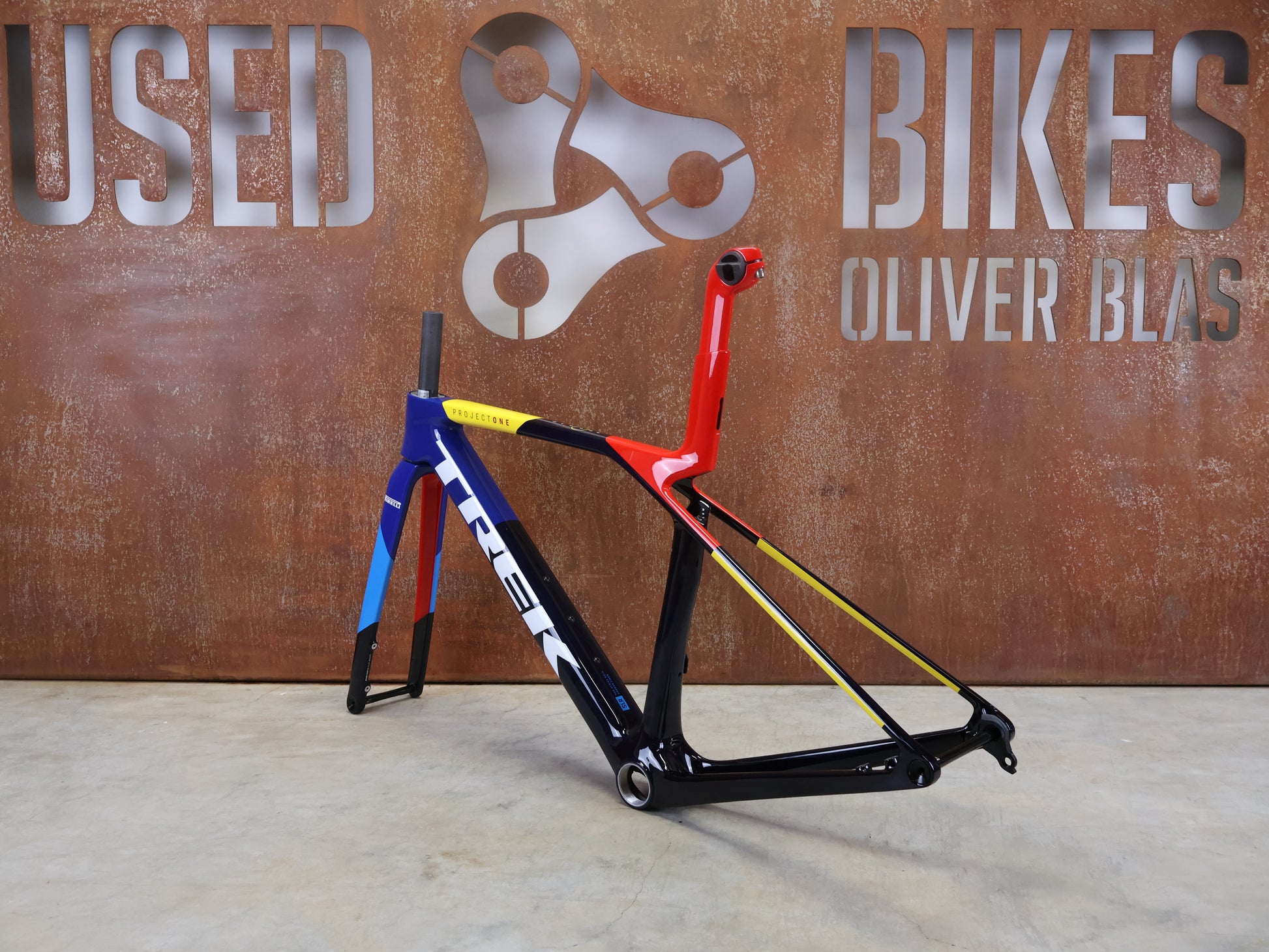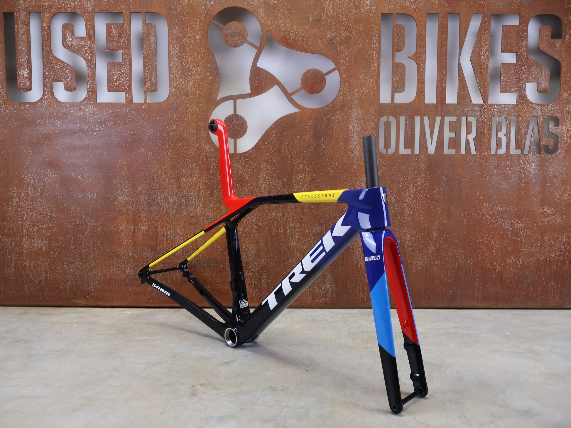 Zusätzlich handelt es sich bei diesem Exemplar um einen originalen LIDL-TREK WorldTour Teamrahmen, ausgestattet mit unterlackierten Pirelli + SRAM - Logos – identisch zu den Team-Bikes.